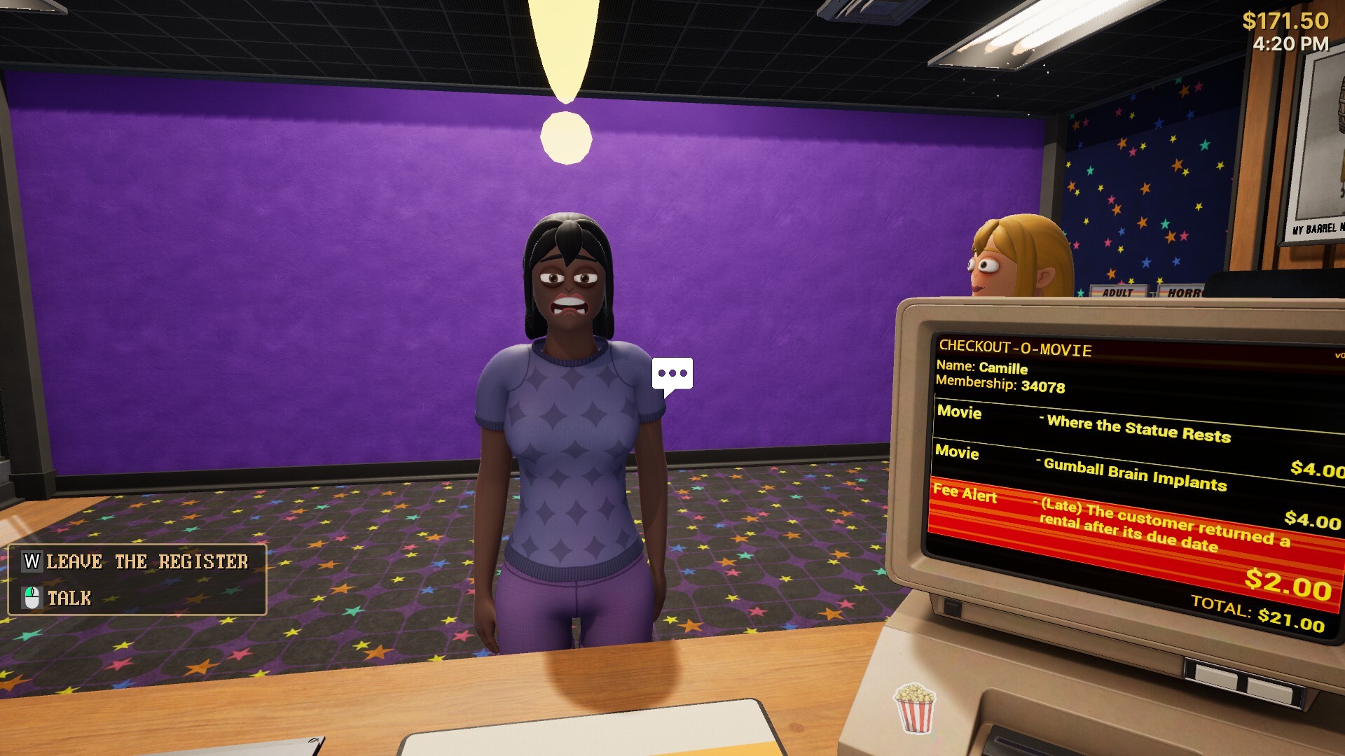 From our research, rewind fees were not a popular business model and were generally disliked by customers. We did not want the checkout interaction to constantly be interrupted by various fees like one client forgetting to rewind a movie, the next returning it late, another having a reservation fee, and so on. For the sake of fun and flow, we have kept it limited to only Late and Broken fees for now. Depending on player feedback, we may revisit this decision in the future.